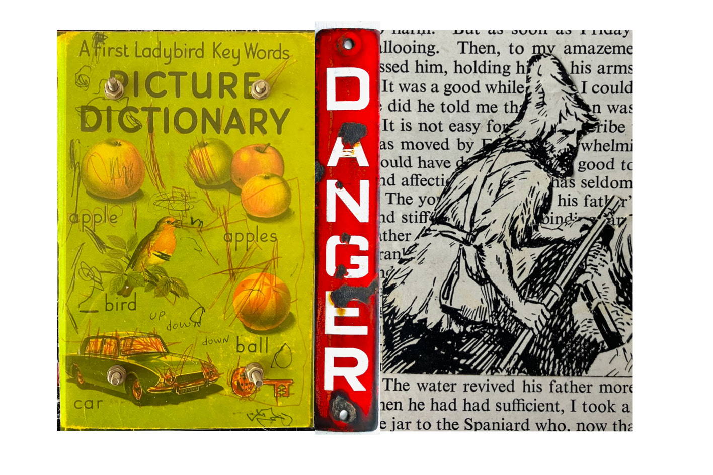 From a 3-D Arte Povera take on Dosteyevsky’s Notes from Underground, to a cut up Robinson Crusoe, from a combustible HB of Zane Grey’s Wildfire (with a wick), to a doll’s house size copy of The Times, and from an assemblage mythologising Duchamp’s sister to a dodo skull reliquary; a store room where books lose coherence and become unreadable.