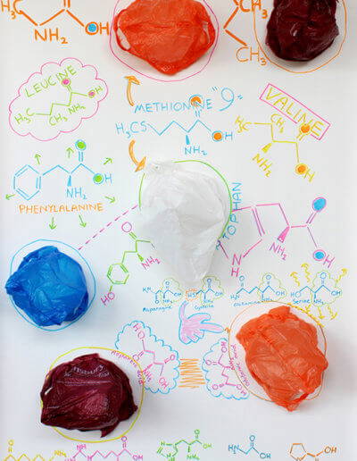 To these mental images we can add metaphors. Tension’s gallery has been turned into a cell for a month. We enter through a membrane of ping-pong balls, proceed to the DNA spiral with blackboard image, that celebrates the work of Rosalind Franklin, before arriving at the “cell graffiti wall”, where the DNA has recreated its signatures, gestures and writing, some little changed in a billion years, depicted here as chemical structures and punctuated with plastic bags. The bags represent the proteins that populate cells and keep everything ticking along nicely.